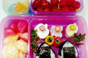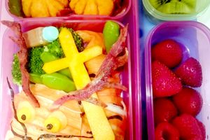 Fake crab meat on top of salted white rice, seaweed and cheese for details of face. I shaped bacon into horns and hands. Boiled broccoli, boiled sugar peas and a cherry tomato with sesame dressing in a small container on the side. The sword is cheddar cheese. I made two small pumpkins out of mashed sweet potatoes, more bacon and italian parsley on the side. Strawberries, raspberries and kiwifruits for dessert.