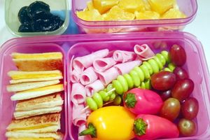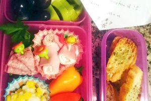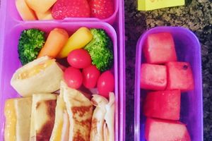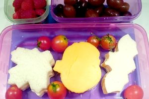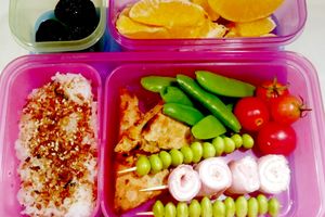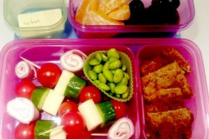 Multi grain grilled cheese sandwiches, fresh cucumbers, cherry tomatos and string cheese on sticks, ham and creamy swiss rolls, and edamame. Seedless grapes and mandarin oranges for dessert.