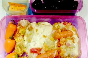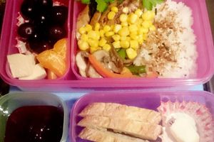 Oyakodon without egg, fresh bell peppers, and fresh cherry tomatoes.