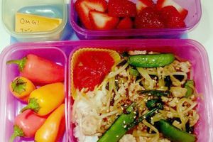 Ground chicken, bean sprouts, green onions and sugar peas cooked with yakiniku sauce over white rice. Fukujinzuke pickles on the side. Fresh bell peppers. Strawberries for dessert.