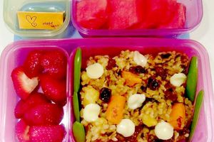 Japanese curry mixed with rice. Boiled sugar peas, raisin, abnd cheese on top. Strawberries and watermelon for dessert.