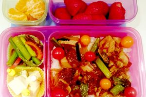 Chicken teriyaki and edamame on sticks. Heart shaped ham and cheese sandwiches, boiled broccoli, carrots and mini bell peppers. Ranch dressing in the green container. Grapes and raspberries for dessert.