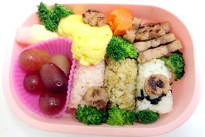 6 small rice balls, three with Aona furikake and seaweed, and the rest are Katsuo. Edamame on a stick, meatballs, flower shaped boiled carrots, boiled broccoli, a blocked cheddar on a stick, and Japanese mayo in a small container on the side. Strawberries and mandarin oranges for dessert.