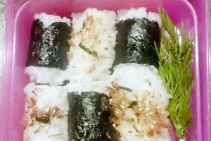 6 small onigiri (salted rice, seaweed, and katsuo furikake), yakiniku beef with onion and bell pepper and fresh dill on the side.