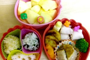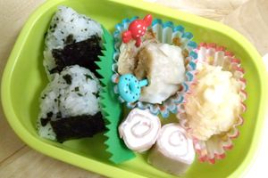 5 small rice balls (seaweed and katsuo furikake), ham and creamy swiss roll on sticks, salami, boiled broccoli and flower shaped boiled carrots. Kiwifruit, seedless grapes and apple sauce for snack.