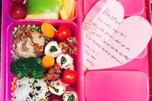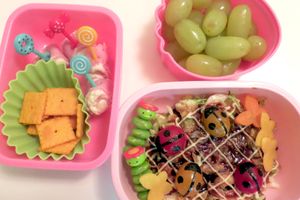 Cheez It crackers, ham and screamy swiss roll for snack, Okonomiyaki with ladybug cherry tomatoes, edamame, cheddar cheese and boiled carrot butterflies. Seedless grapes for dessert.