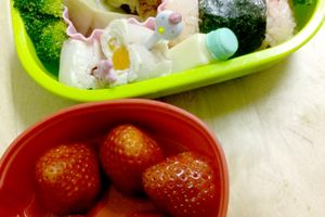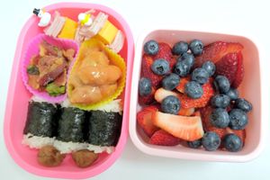 Rice balls with seaweed, two umeboshi on the side, ham and cheese sticks, brussel sprut with bacon, yellow curry carrot. Strawberries and blueberries for dessert.