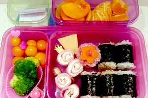 Two rice balls, one with wakame rice mix and one with ground beef cooked with soy sauce. Boiled broccoli and boiled carrots. Fresh cherry tomatoes and small sausages on sticks. Radish sprouts and creamy swiss rolled with ham. Apple slices, seedless grapes, white and orange cheddar cheese for dessert.