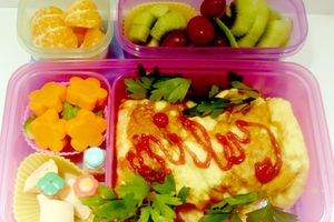 Omurice with seaweed. Boiled broccoli, fresh cherry tomatoes on sticks, baked botatoes, string cheese slices, and ketchup in a small container on the side. Mandarin oranges, seedless grapes, and apple sauce for dessert.