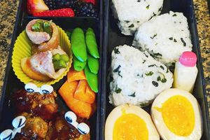 Two umeboshi rice balls wrapped with seaweed, ham and swiss rolls, boiled carrots inside the rolls boiled broccoli, Japanese mayo in a small container. Gyoza and shumai are from Trader Joe's.