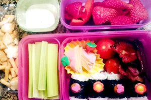Four small onigiri with seaweed, ham and cheese on sticks, honeyed bacon, cherry tomatoes, fresh celeries with ranch dressing. Strawberries for dessert. Rice crackers for snack.