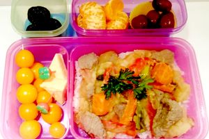 Nikujaga over white rice. Cherry tomatoes and aged cheddar on food picks. Mandarin oranges, seedless grapes and dried prune for dessert.