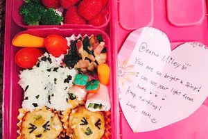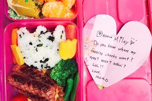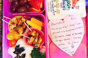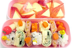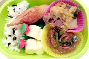 Rice with wakame mix, mini sausages, boiled sugar peas, boiled carrots, tamagoyaki rolled with spinach, and cherry tomato with creamy swiss.