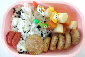 Wakame mixed rice with umeboshi on the side, chicken apple sausage and string cheese and boiled carrot on food picks.