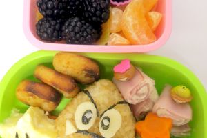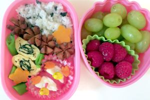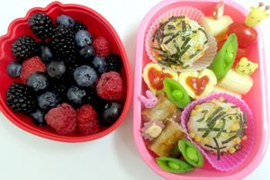 Created a Goomba and Star from Super Mario Brothers. I used curryfor the head, and ketchap for the body, thick hams for the feet. Star is made with egg and cheese. Seaweed and white cheddar slices are very handy to use for parts! Anpanman potatoes, ham and creamy swiss on food picks, boiled broccoli and boiled carrots. Blackberries, raspberries, blueberries, seedless grapes, and mandarin oranges for dessert. I buy these berries at Costco! They are organic and great!