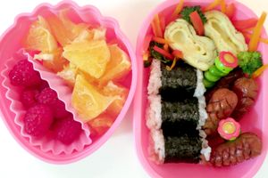 Three onigiri mixed with umeboshi and wrapped with seawed, mini sausages, boiled broccoli, edamame, boiled carrot and fresh red bell pepper slices. White cheddar rolled in tamagoyaki. Oranged and raspberries for dessert.