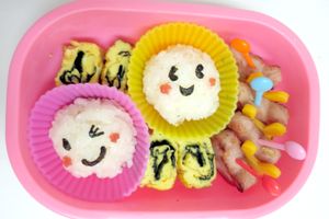 Two rice balls with face, tamago yaki with spinach, thick ham and cheese.