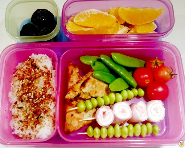 I found these good samosas at Costco and we love them! White rice with katsuo furikake, boiled sugar peas, edamame on sticks, ham and creamy swiss on a stick, and cherry tomatoes. Oranges and dried prunes for dessert.