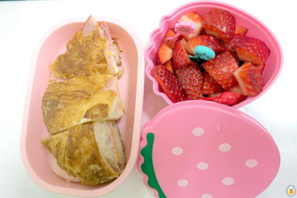 Ham and cheese croissant sandwich, strawberries for dessert! Super easy!