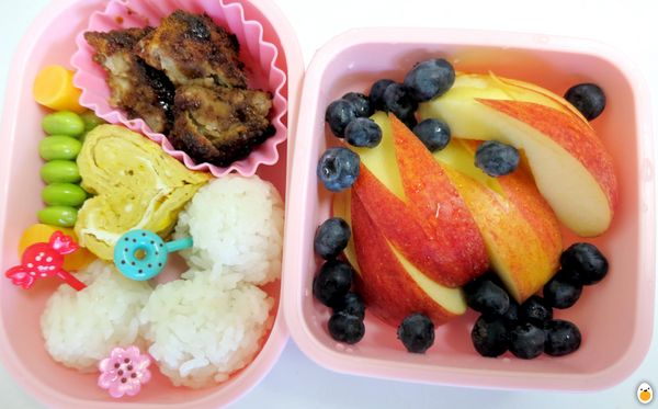 Tonkatsu Sauce over Curry Croquettes, tamagoyaki, rice balls, edamame and boiled carrot.