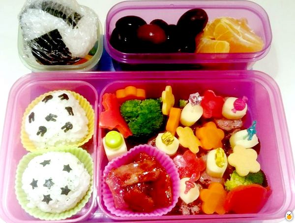 Two salted rice balls with shaped seaweeds. Honeyed bacon, boiled broccoli with Japanese mayo in a small container on the side, leaf shaped fresh bell peppers, flower shaped boiled carrots and cheddar cheese slices, strig cheese and chicken apple sausages on sticks. Seedless grapes and mandarin oranges for dessert. One salted rice ball with seaweed for her friend at school. :)