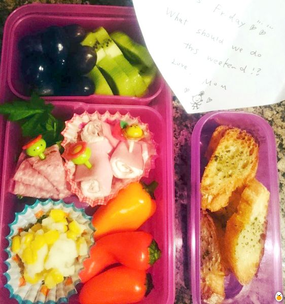 Garlic bread. Creamy swiss and ham rolls, salami, mashed potatoes with corn, fresh bell peppers and italian parsley on the side. Kiwifruit and seedless fruit for dessert.