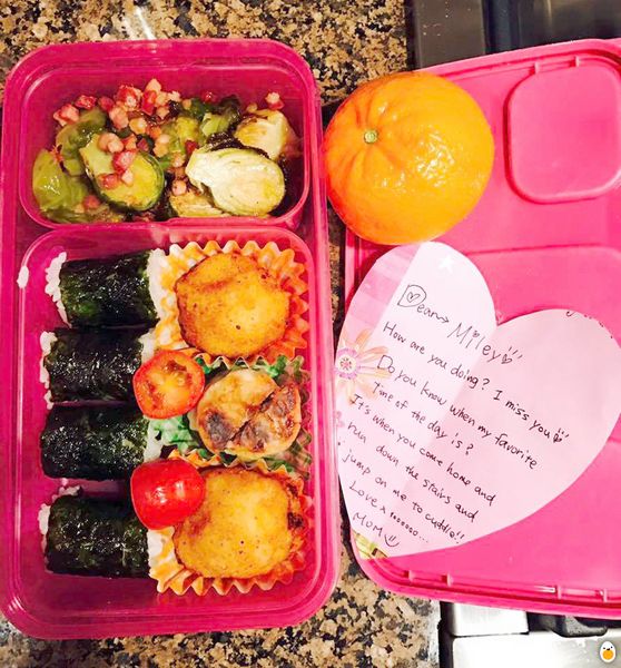 Four small rice balls wrapped with seaweed, two mac and cheese balls, one shumai, a fresh cherry tomato, brussel sprouts with bacon. A mandarin orange for dessert.