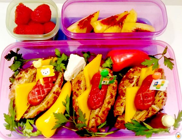 Three mini croissant hot dogs. Added cheddar slicesn creamy swiss, fresh small bell peppers, italian parsley, and ketchup in a small container on the side. Peaches and raspberries for dessert.
