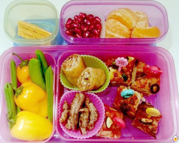 Pizza bread I found in downtown yesterday. A spring rolls, Korean BBQ kalbi, boiled sugar peas and fresh bell peppers. Mandarin oranges and pomegranate for dessert.