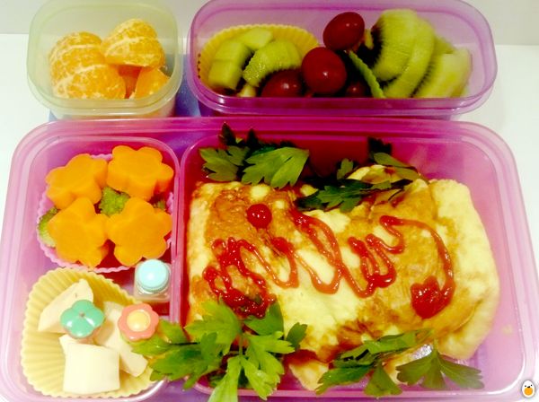 Omu rice with italian parsley on the side. Boiled broccoli, flower shaped boiled carrots, blocked cheddar cheese and Japanese mayo in a small container. Kiwifruit, seedless grapes, and mandarin oranges for dessert.