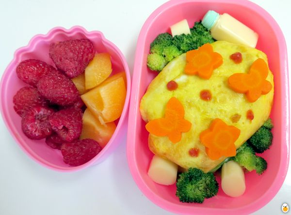 Omurice and boiled carrots and broccoli, Japanese mayo in a small container, string cheese. Peach and raspberries for dessert.