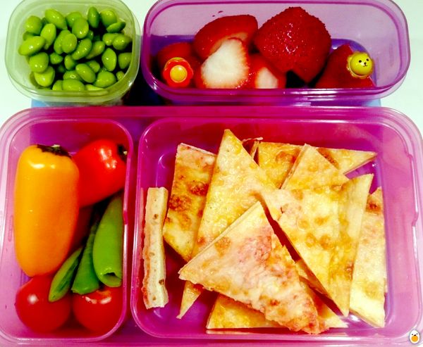 Cheese pizza slices from whole foods. Smal bell peppers, boiled sugar peas, cherry tomatoes, and edamame. Strawberries for dessert.