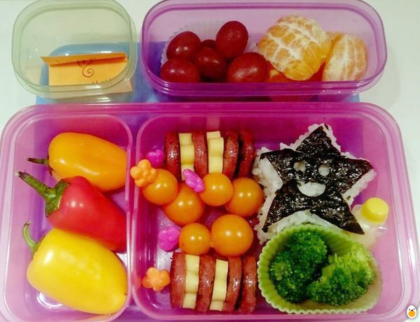 A star shaped onigiri mixed with Aona furikake and seaweed on the top. Boiled broccoli, cherry tomatoes, fresh mini bell peppers, and Japanese mayo in a small container. Chicken apple sausage slices with flower shaped cheddar cheese on food sticks. Mandarin oranges and seedless grapes for dessert.