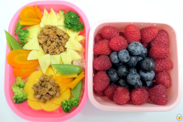 I created 2 flowers onver white rice. Boiled broccoli, boiled carrot, boiled sugar peas brings bright color. Flower petals are made out with eggs and cheese, middle is ground chicken with yakiniku sauce.
