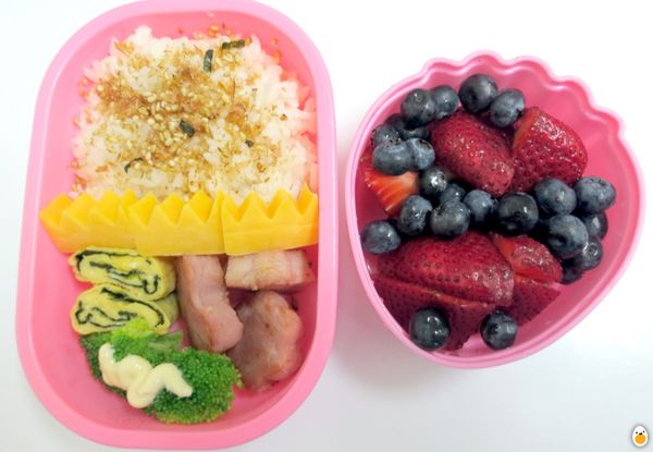 Katsuo furikake over white rice, cheddar cheese cutouts, spinach rolled in tamago yaki, thick ham and broccoli. Japanese mayo on the top. Strawberries and blueberries.