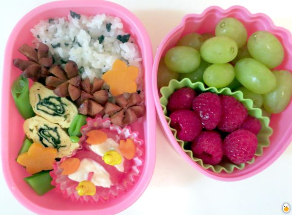 Rice with wakame mix, mini sausages, boiled sugar peas, boiled carrots, tamagoyaki rolled with spinach, and cherry tomato with creamy swiss.