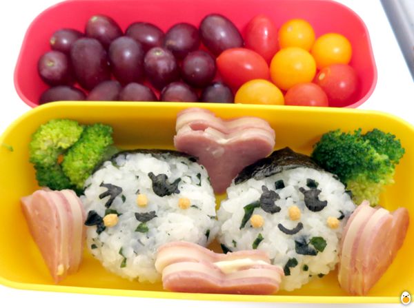 Two rice balls with wakame gohan mix. I used seaweed nori punch to make eyes and mouth with seaweed. Nose and cheeks are rice crackers found in Ochazuke no Moto.