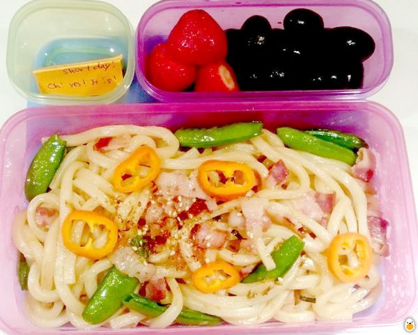 Soy sauce based Yakiudon (Bacon, bell peppers, sugar peas). Strawberries and seedless grapes for dessert.