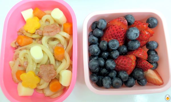 I made a soy sauce base yaki udon today. For the topping, boiled carrot, cheddar cheese and thick ham. I cut string cheese into pieces but my daughter says nobody eats it that way!! Strawberries and blueberries for dessert.